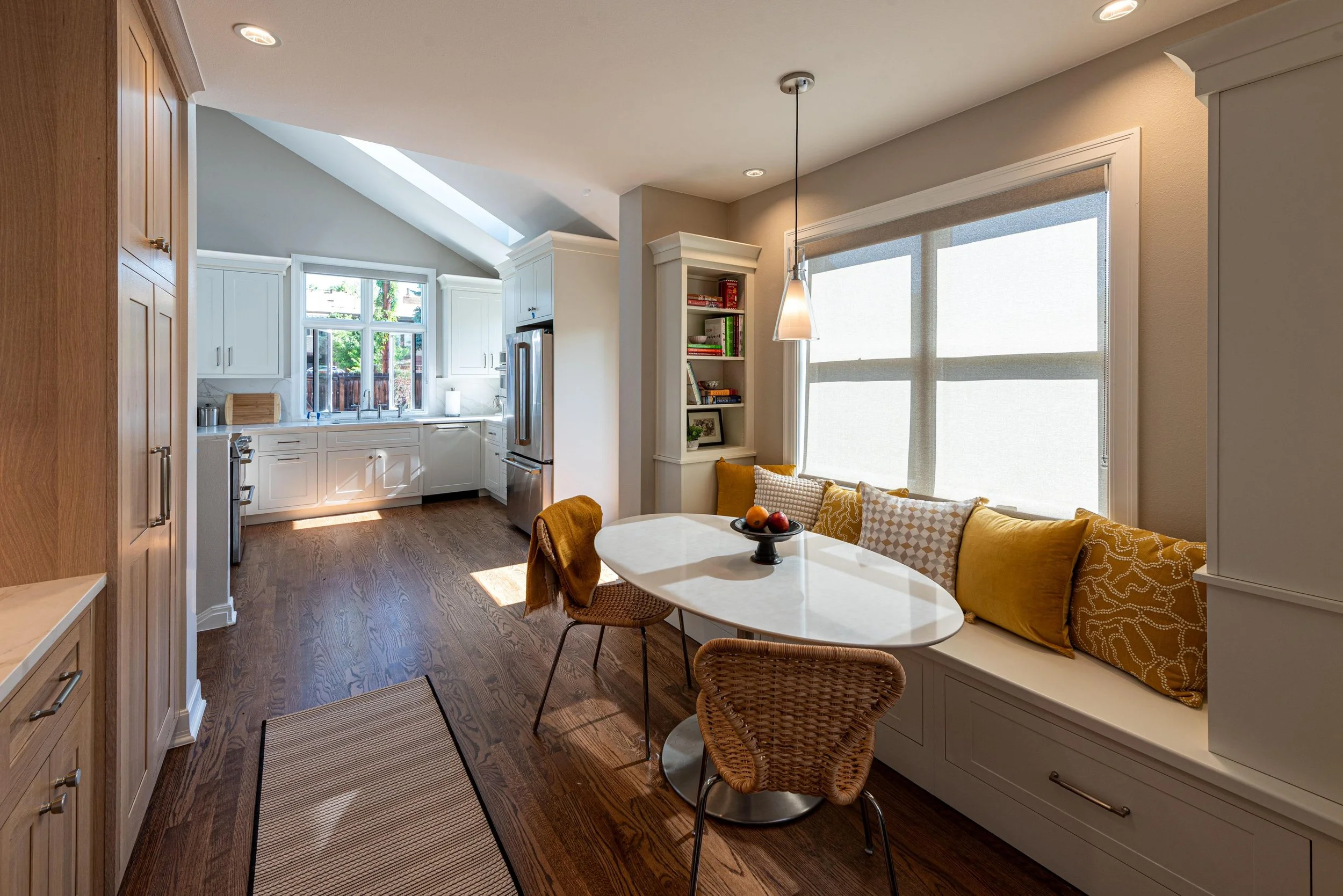 The new kitchen is 11x13 feet, and extends out from what was the old kitchen, now repurposed as a sunny bookcase flanked breakfast banquette, with a wall of white oak cabinetry that includes tall pantry cabinet and a beverage center with refrigerator. Traffic now bypasses the work triangle completely.