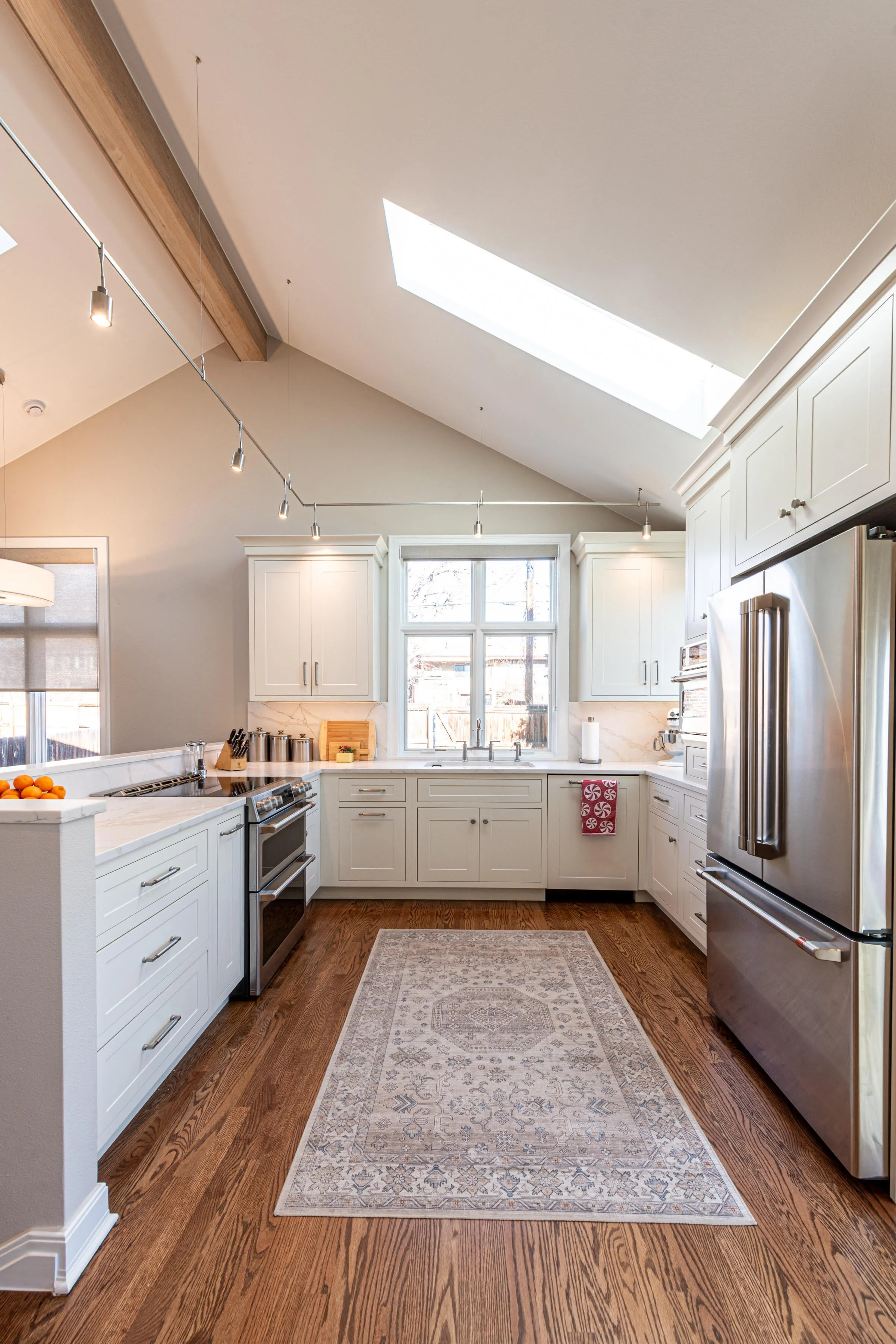 Both kitchen and family room benefit from the soaring 13- to 16-foot-high vaulted ceiling, punctuated a skylight on east and west that insure the space is bright, even on the gloomiest day. The addition was finished with cement board and batten siding, painted to match the bronze window cladding, with an accent panel of brick veneer salvaged from the demo of the old back wall on the backyard side. With R60 ceiling and R30 walls, as well as a sealed and insulted crawl space, this addition is far cozier in all seasons than the original all (uninsulated) brick home. It has its own thermostat controlling a mini split system for both winter and summer comfort.